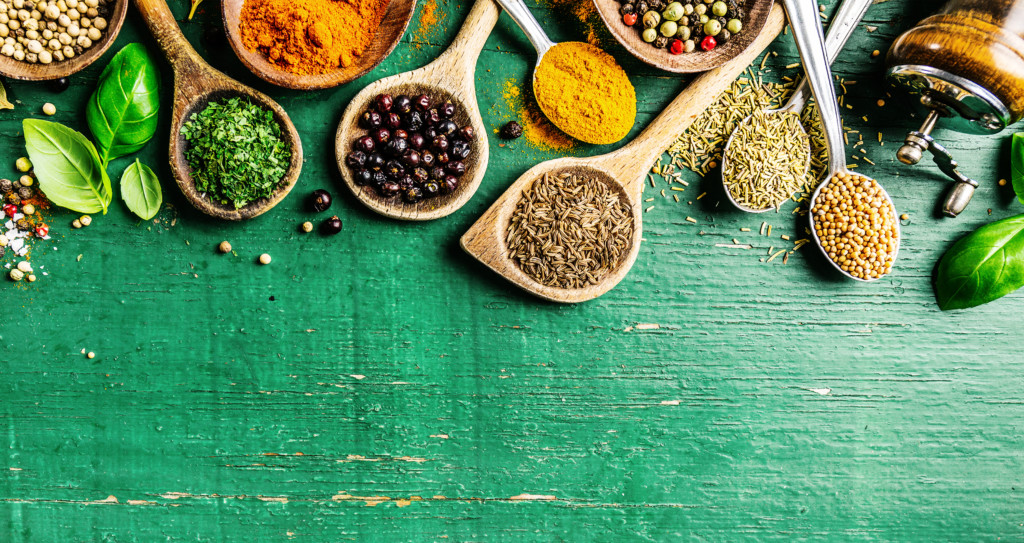 Different spices and herbs on old green wooden background. Top View with Copy Space.